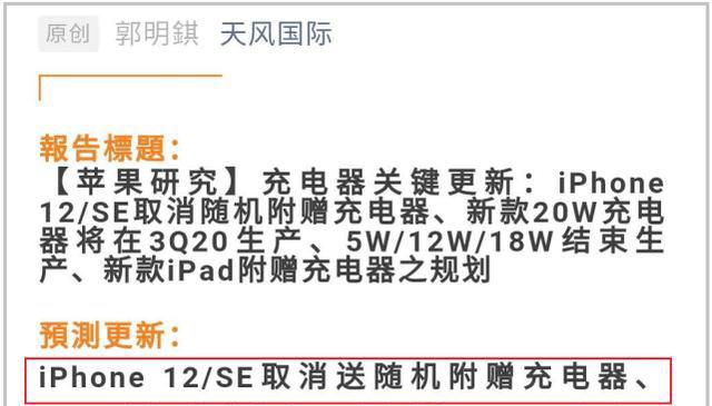 就在这时候,关于iPhone12的权威曝光消息不断传来,今年和往年不同的是,苹果不会继续赠送耳机和充电器了,除了降低物料成本之外,也是出于环保因素考虑。来自天风国际知名分析师郭明琪的消息,iPhone12将取消附赠充电器,新款的20w充电器也将会在2020年Q3季度生产,5w、12w、18w充电器将退出历史舞台,新版本ipad的附则充电器规划正在实施。