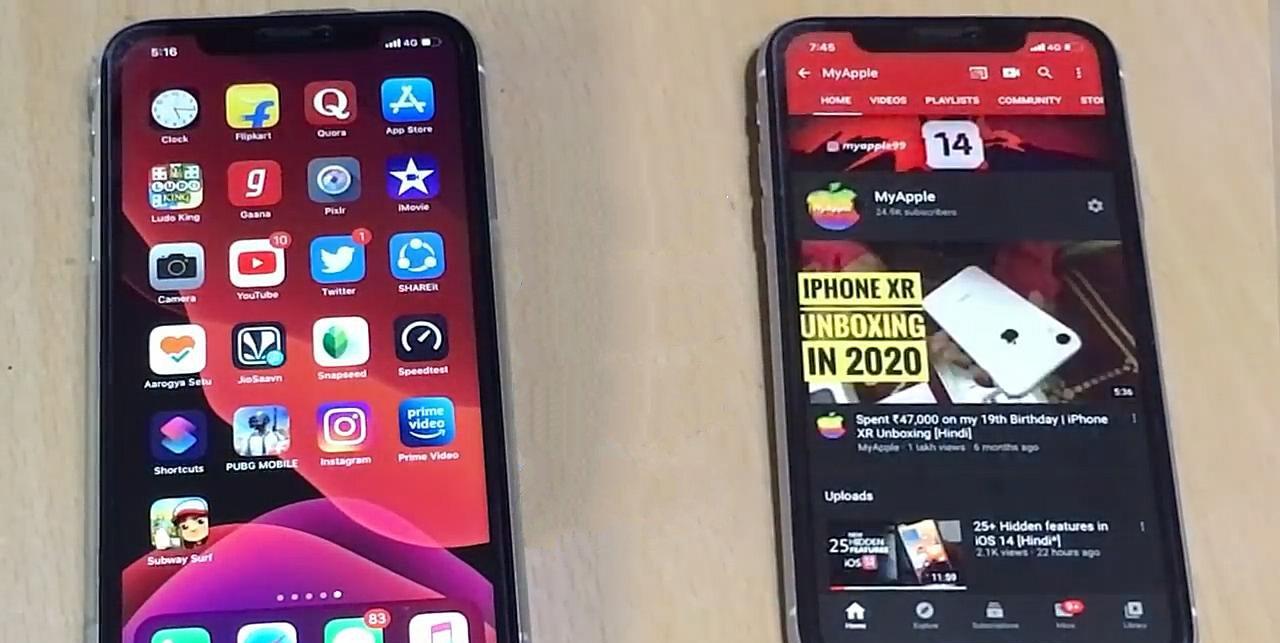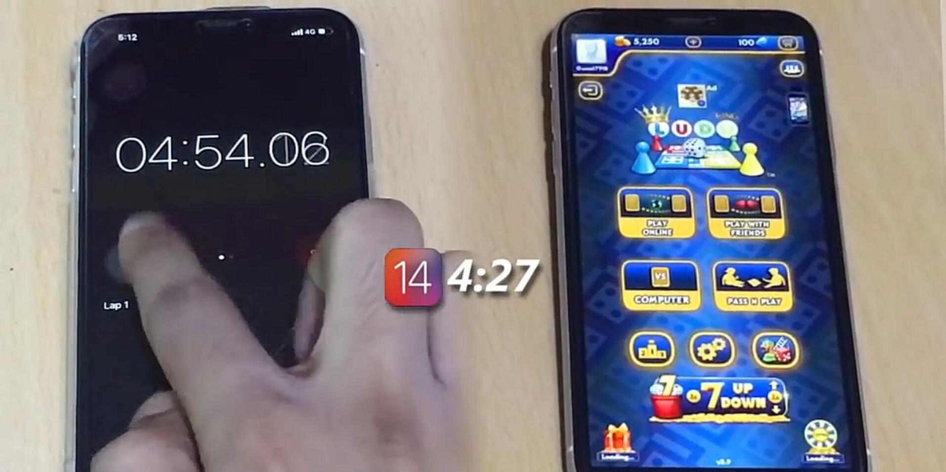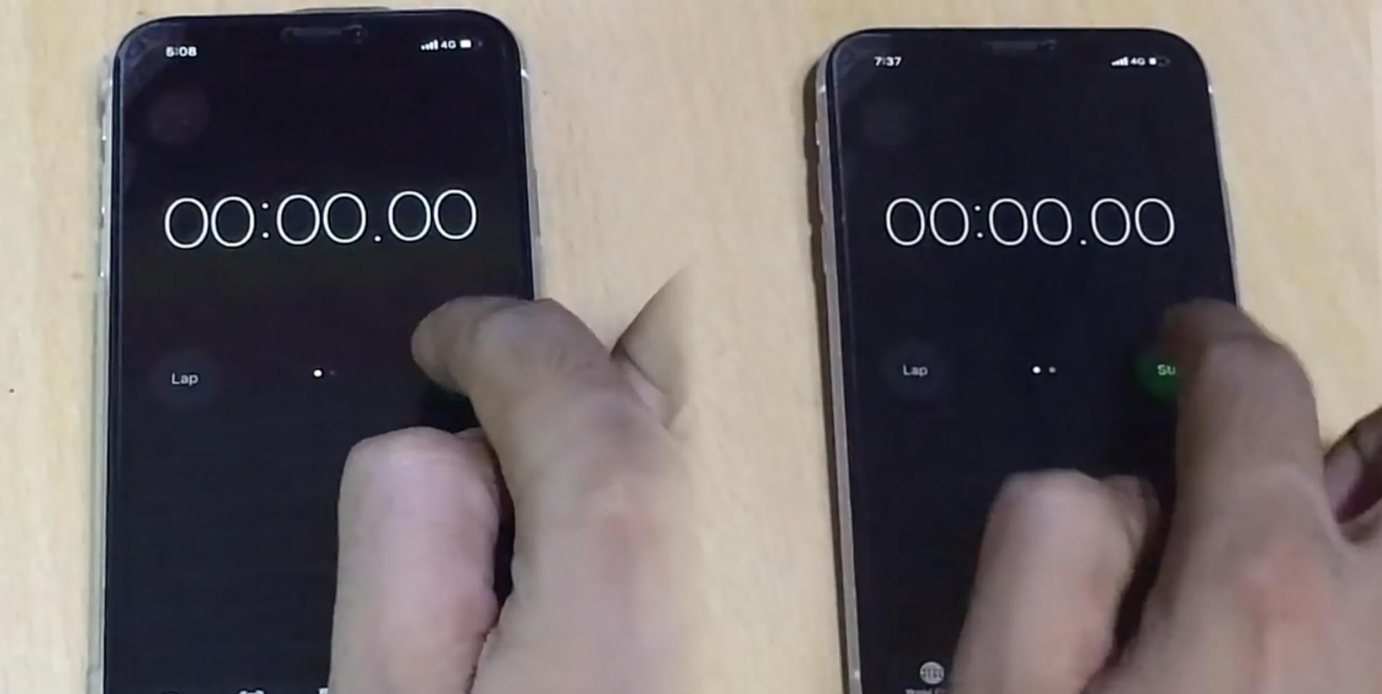 左边这款iPhone11运行iOS13.5,而右边这款iPhone11运行iOS14测试版。在测试开始后,iOS14测试版暂时处于落后,但在某视频编辑渲染时,iOS13.5则意外落后了。