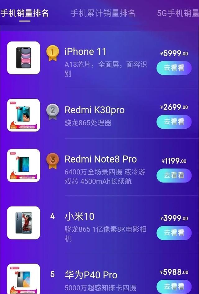 一年一度的618购物节即将落下帷幕,在智能手机厂商中最大的赢家无疑是苹果了。在618手机销量排行榜中,4G手机销量排行和累计排行榜中,iPhone 11稳居榜首,这个排名几乎就不曾变过。要不是苹果还未推出5G手机,那5G手机排行榜的排名肯定也有它一席之地,或许依然会占据第一的位置。