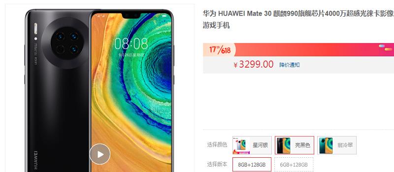 在第三方平台,8GB+128GB版本华为Mate30价格降至3299元,短短9个月价格跳水1000元,降价幅度不可谓不大。