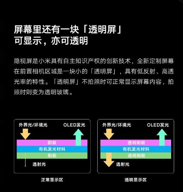 首先在透光问题上,OPPO 采用了微透镜技术,而小米则是直接在屏幕上完成了“低反射”跟“高透光”,这样做的好处是节省了机身内部空间,同时还能保证前置成像。
