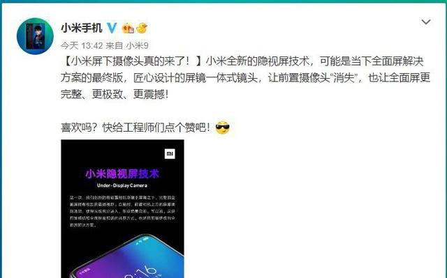 但技术的不完美只是暂时,不久前小米就正式宣布已经研发出可隐藏的屏下摄像头方案。