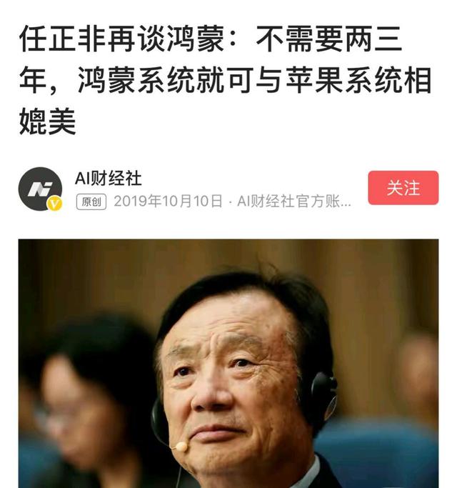 在华为传出将发布鸿蒙系统的消息不久,任正非在接受媒体采访时表示:不需要两三年的时间,鸿蒙系统就可以跟苹果的iOS 系统相媲美。