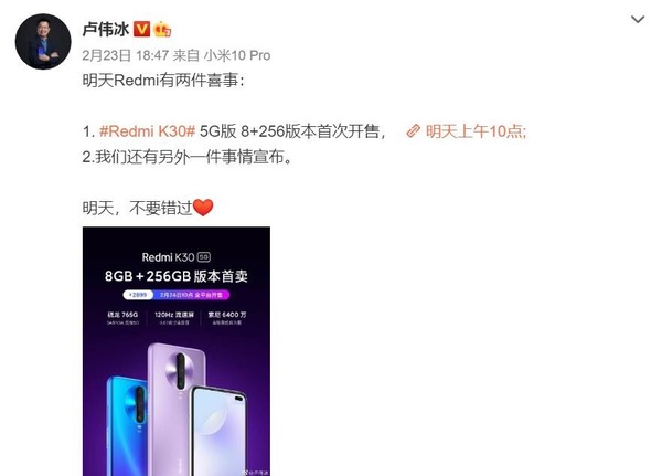 ◎Redmi K30 5G 8GB+256GB版本今日开售 Pro或官宣