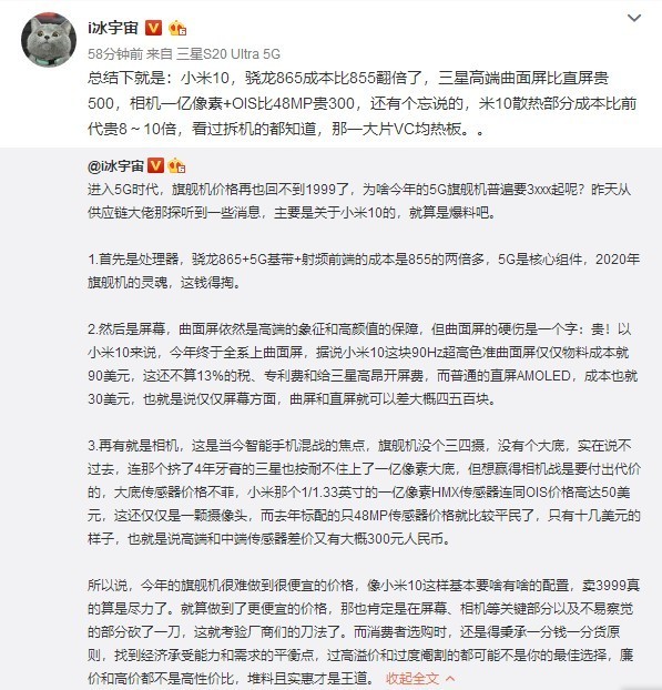 毫无疑问,今年5G手机是潮流。去年5G商用牌照发放以来,手机厂商们已经推出了不少5G旗舰手机。并且它们都有一个共同的特点,那就是:贵。有人说,进入5G时代旗舰机的价格就再也回不到1999元了。那么,为什么今年5G旗舰机的售价普遍都在3000元以上呢?2月26日,数码博主@i冰宇宙 发表了自己的看法,我们一起来看一下。