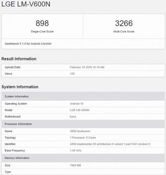 根据这款手机的跑分结果,LG V60 ThinQ 5G单核跑分898分,多核跑分3266分,运行Android 10系统并辅以8GB运存。值得注意的是,这款手机的主板代号为“kona”,而这恰好也是高通骁龙865的代号,基本可以确定LG V60 ThinQ 5G将会搭载这款芯片。