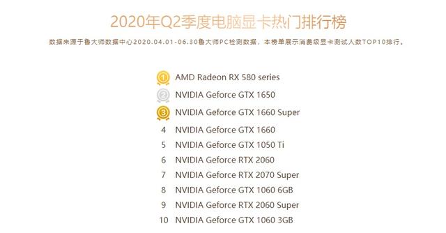 而从鲁大师公布另外一份2020年第二季度的显卡热门榜单之中来看,最热门的显卡却不是N卡而是RX580这张A卡,看来尽管英伟达在性能上还是占据着优势但是在性价比上还是不如A卡呀。