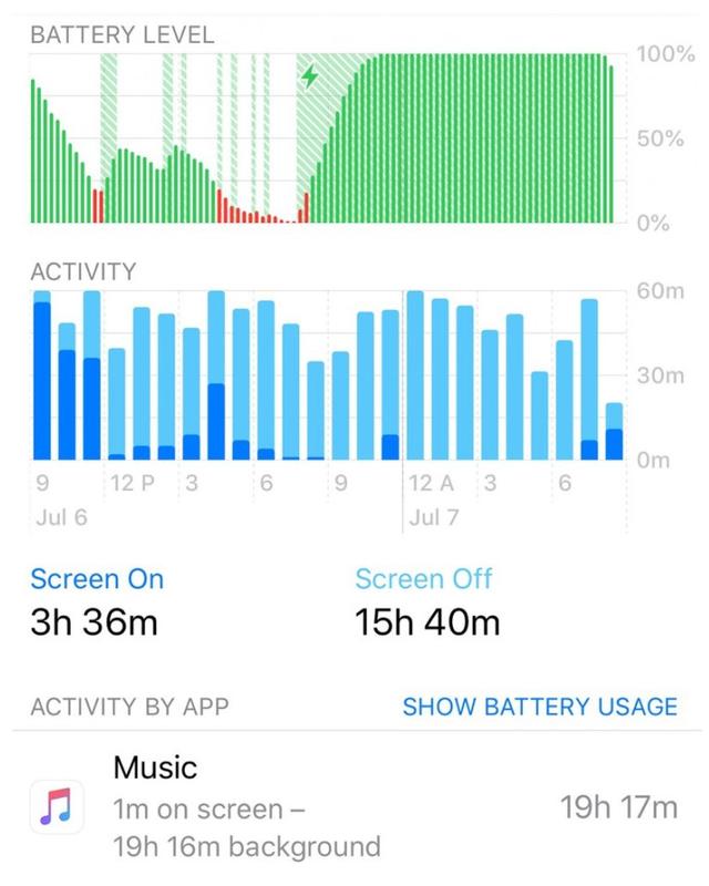 而许多用户表示其中的原因就有关于苹果的这个自带系统应用—音乐APP,通过iOS系统上自带的电量消耗情况来看,这个内置的Music应用会在后台中频繁唤醒使用并因此导致用户的iPhone好点一场,出现电量消耗过大的情况。