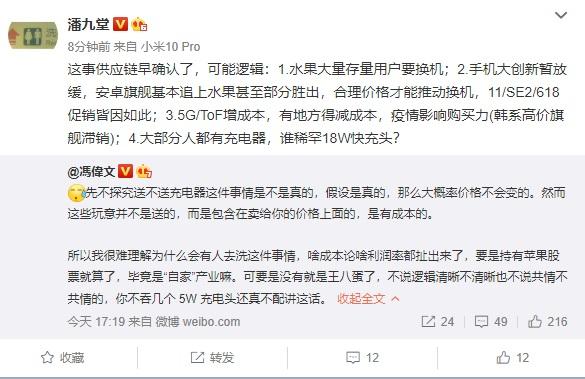 之后前分析师、现小米产业投资部合伙人潘九堂也是微博回应称iPhone 12或将不再随手机附赠充电器这一消息其实供应链方面早就确认了的。