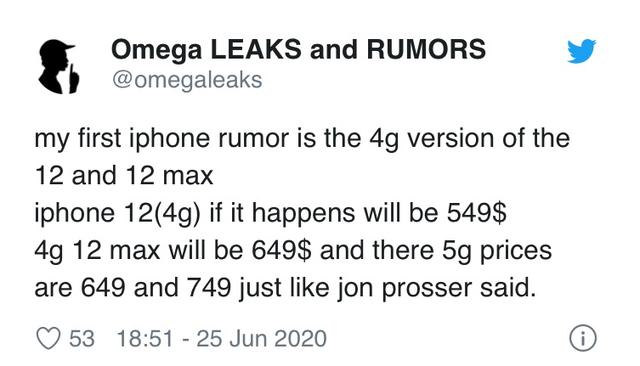 而又关于价格,此前的爆料称5G版本的iPhone 12可能将会售价649美元起,而这位爆料人称4G版本的iPhone 12或将549美元,也就是折合约3885元起。