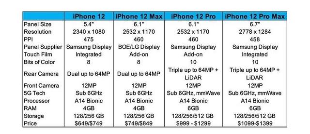 而在后摄方面,前两款比较基础的机型将会搭载后置6400万像素的双摄镜头,而另外两款则将会搭载配备了激光雷达传感器的6400万像素的三摄,CPU方面都会使用苹果下一代最强的A14处理器。