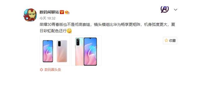 最近就有知名数码博主@数码闲聊站就曝光了最新的荣耀30青春版的消息,并且原话称:"荣耀30青春版也不是彻底套娃,镜头模组比华为畅享的更加矩阵,并且机身弧度更大,夏日彩虹配色还行。"