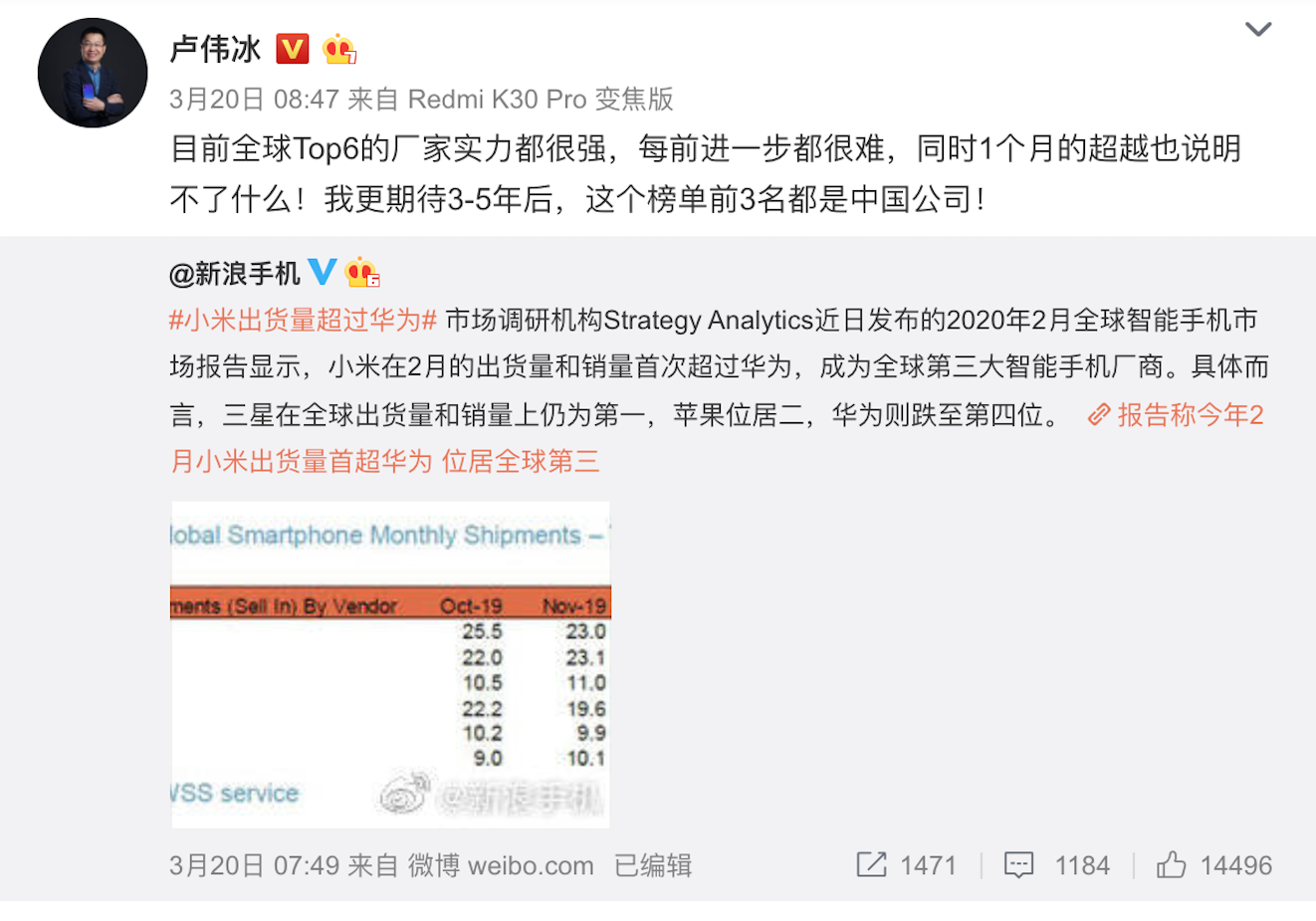 销量暴跌60%!小米反超华为荣登全球第三,三星地位稳固!