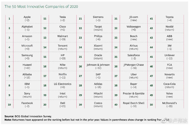 值得一提的是,在上周波士顿集团(BCG)公布的“2020年全球最近创新力TOP50”榜单中,华为、腾讯、小米也分别位列第6、14、24名。这表明今年虽然经济形势不佳,但是具备创新力的企业仍然保持较强的增长势头。