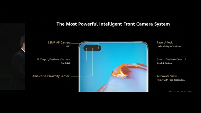 华为P40 Pro的前置摄像头主摄为3200万像素,还配备了一个红外深度/手势传感器,从而实现了更高级别的人脸识别。