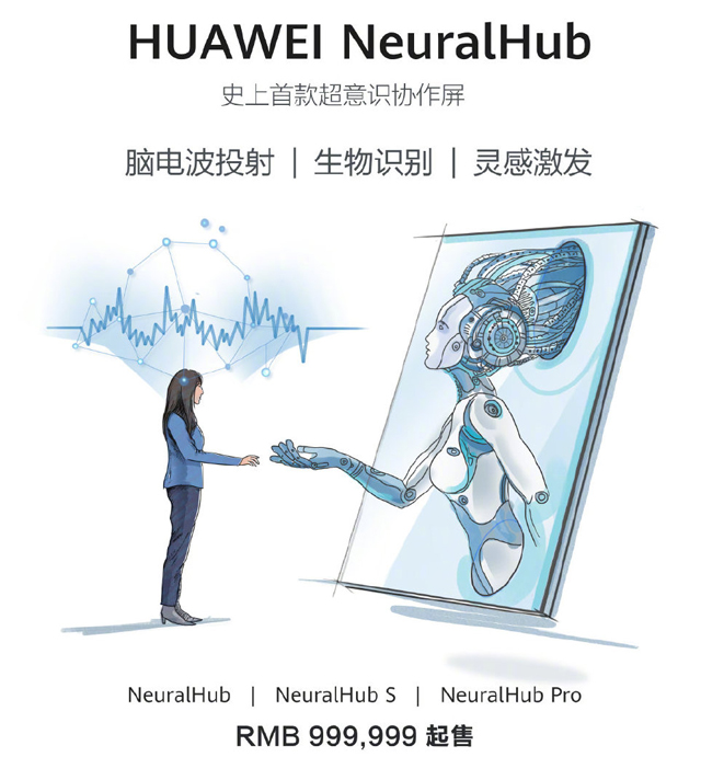 今天华为也发布了一款名为“HUAWEI NeuralHub”的产品,它号称是“史上首款超意识协作屏”,支持脑电波投射、生物识别、灵感激发。有NeuralHub、NeuralHub S、NeuralHub Pro三个版本。老实说小编也没有弄明白这款产品是用来做什么的,主要是999,999的价格实在太夸张了,暴露了它其实是一个愚人节的一个玩笑。但是华为也透露将在4月17日发布一款“华为企业智慧屏”,可能也会采用类似的高科技。