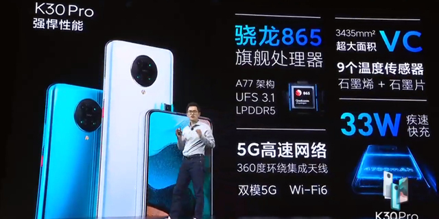 从硬件配置上来看,Redmi K30 Pro和3000元以上的同类865机型相比也不遑多让。和此前曝光的一样,Redmi K30 Pro两个版本均搭载高通骁龙865处理器,以及LPDDR5运存和UFS3.1闪存(6GB版为LPDDR4X+UFS3.0)。同时还采用了360°环绕天线和WiFi6,并支持NSA/SA双频5G以及n41/n78/n79/n1/n3频段。此前卢伟冰就曾透露过,高通骁龙865处理器以及配套的天线成本价格都在1000元以上,这也是今年865手机价格水涨船高的主要原因。