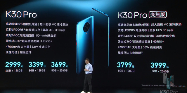 最后是价格方面,Redmi K30 Pro标准版6GB+128GB售2999元,8GB+128GB售3399元,8GB+256GB售3699元。Redmi K30 Pro超级变焦版8GB+128GB售3799元,8GB+256GB售3999元。