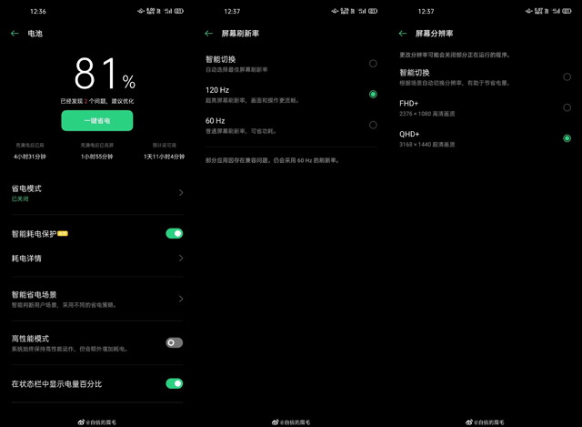 针对高分辨率高刷新率屏幕可能带来的耗电问题,OPPO Find X2也提出了自己的解决方案。首先这款手机支持65W的Super VOOC超级闪充,30分钟出头即可将电量充满。其次从OPPO副总裁沈义人公布的续航数据来看,OPPO Find X2在最高刷新率和分辨率下,使用4小时31分钟后(亮屏1小时55分钟),电量还剩下81%,续航表现还算不错。最后该机也支持60Hz刷新率和1080P分辨率,可以根据实际的使用需求来调整屏幕参数,延长续航时间。