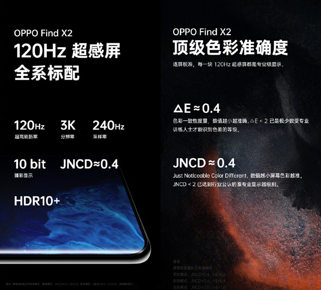 除了全系标配120Hz屏幕之外,OPPO Find X2的这块屏幕还拥有顶级的色彩准确度,它支持10 亿色臻彩显示,MEMC高速动态补偿,并支持HDR10+功能。它的屏幕JNCD值约等于0.4,高于公认的准专业显示器标准。这就意味着除了玩游戏之外,OPPO Find X2的屏幕在显示图片、观赏视频时也能带来更好的视觉体验。