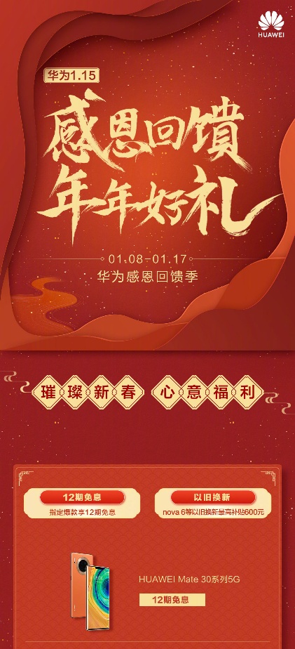 近期,华为也推出了感恩回馈季新春优惠福利,华为Mate30系列5G版等爆款手机12期免息以及nova 6等以旧换新最高补贴600元等等多重福利。孝敬父母犒劳自己,选一款心仪的礼物带回家,和华为Mate30系列5G版一起过一个幸福年,岂不美哉!