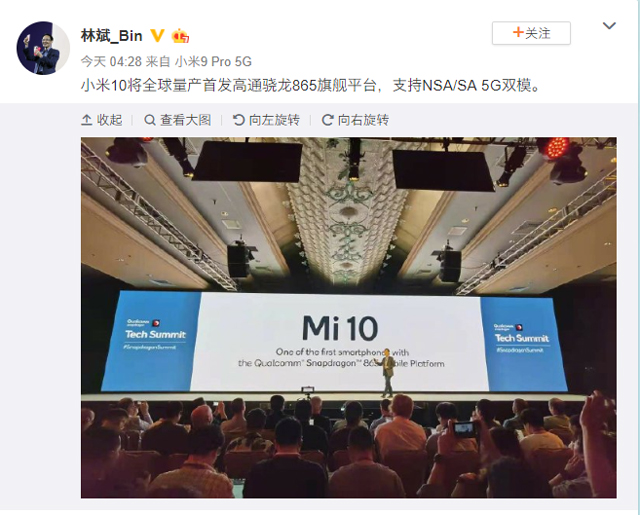 小米联合创始人、副董事长林斌应邀在此次高通骁龙技术峰会上发言,他表示:小米将全力推动5G手机的研发和推广,并将于明年第一季度推出5G年度旗舰手机小米10,并成为首批搭载骁龙865移动平台的智能手机厂商之一。林斌还再其个人社交媒体确认:小米10将全球量产首发高通骁龙865旗舰平台,支持NSA/SA双模。