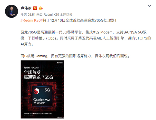与此同时,小米的独立子品牌Redmi总经理卢伟冰也在其个人社交媒体上宣布:Redmi K30将于12月10日全球首发高通晓龙765G处理器。他同时还表示:“骁龙765G是高通最新一代5G移动平台,集成X52 Modem,支持SA/NSA 5G双模,下行峰值3.7Gbps。同时采用了第五代高通AIE人工智能引擎,拥有5TOPS的AI算力。而G就是Gaming,拥有更强的图形运算能力...”