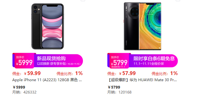 目前在京东联盟后台的销售数据显示,iPhone 11的月销量为426332台,是同价位国产旗舰手机华为Mate 30 Pro(120618台)的3.5倍。显然在5000元到6000元的高端价位,iPhone 11比国产手机更具竞争力。