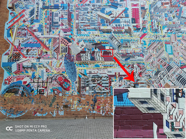 小米CC9 Pro的1亿800万像素的主摄非常适合拍摄复杂的场景。如上图中墙壁上的图画,截取1%的局部画面再进行放大,会发现细节非常的清晰。这就是1亿像素画质解析力带来的优势。不过相对对,拍摄1张1亿像素的照片需要占用30MB的内存空间,因此选择较大容量的版本可能会更合适一些。