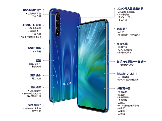 荣耀20S还内置了3750mAh的电池,支持20的快充。机身厚度只有7.87mm非常的轻薄。比较遗憾的是没有耳机孔,也不支持NFC。