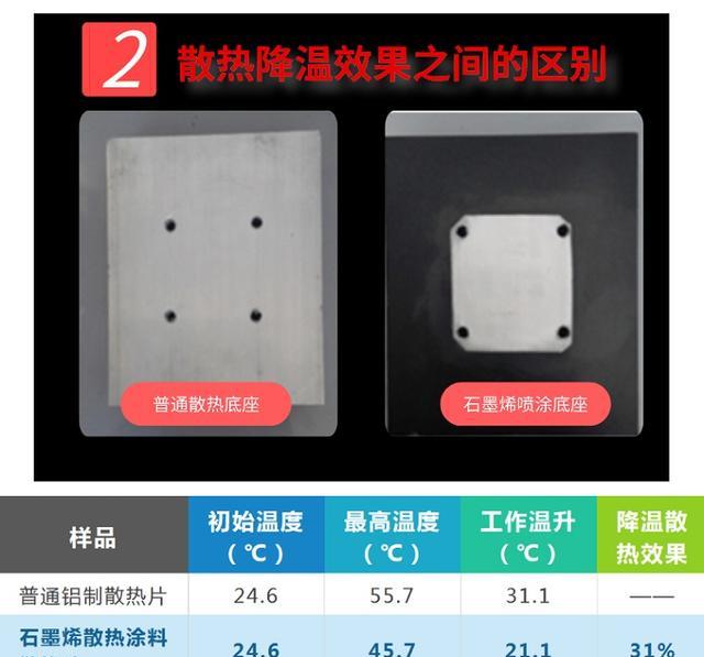 以LED底座的实际应用为例,在相同温度的工作环境下,喷涂了石墨烯散热涂料的LED的灯座温度下降了30%的比例,这点对于它的使用寿命及效率都能够得到极大的延长。