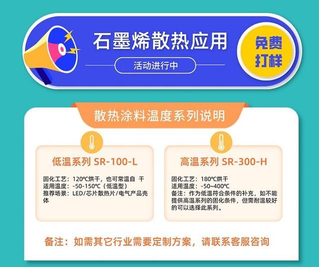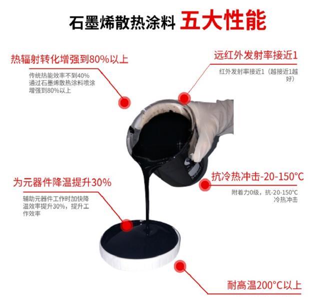 石墨烯散热涂料分别有低温及高温系列,根据散热温度要求选择所需的散热涂料参数规格,过技术参数指导进行合理的喷涂,达到更好的散热效果。