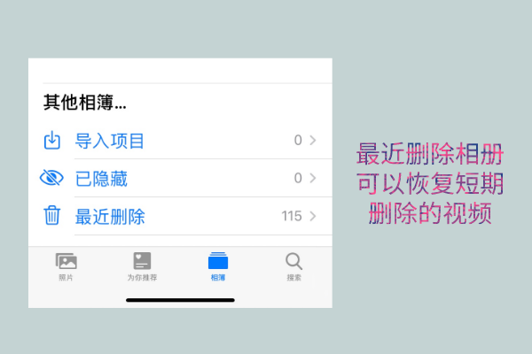 这个大家应该都有操作过,先删除了手机照片,然后去最近删除相册里面找到,然后就恢复到原来的相册位置了。那么为什么能够回来呢?最近删除相册是我们的手机回收站,该相簿会保留我们在30天之内删除的照片,但是我们千万不能够清空哦,否则的话你找回来就得花点时间了。