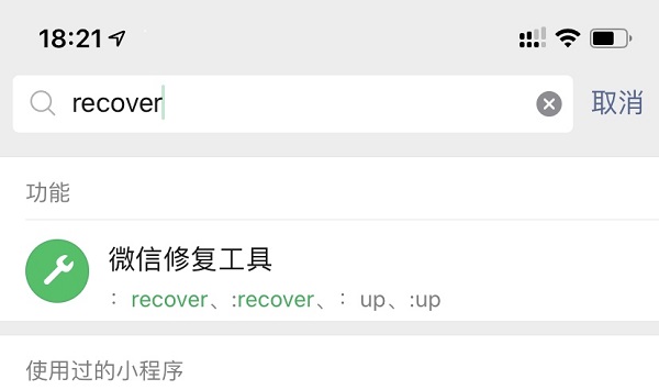 这是去年很火的恢复聊天记录的方法,其实是微信自带的修复功能。操作也很简单,这里介绍最快速的在微信中搜索到的方法,只需要在微信搜索框里直接搜索“recover”就能直接定位并进入到修复页面,不需要我们在微信设置里面一个一个选项的去寻找。