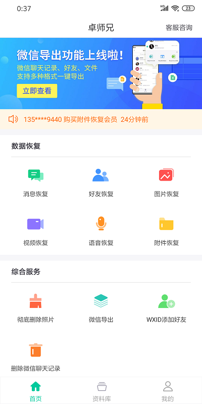很简单人为原因导致的删除了微信聊天记录,无论是在接收消息栏页面里删除的,还是好友聊天页面内直接删除的,即使没有备份信息也是可以恢复回来的,但是我们需要用到专业的数据恢复工具,例如卓师兄。