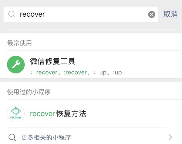 这个时候,我们就可以使用微信自带的修复工具,我们在微信页面顶部的搜索框里,输入“recover”,就能看到下方搜索结果中跳出的“微信修复工具”,点击进入后选择“故障修复”-“聊天记录”根据提示点击确定等待即可。