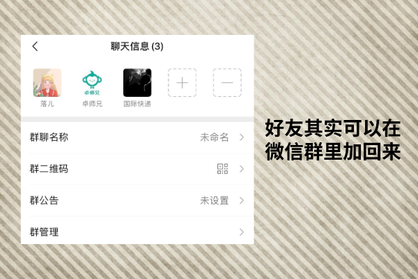 大家和曾经聊得很好的一些好友们,应该会有一些微信群吧,我们可以记忆一下,你删除的好友是否是在群里面添加的呢,或者是自己去群看一遍,如果看到了删除的好友,直接加回来就可以了!这样来说,以后最好是把一些好友拉到一些爱好群里,这样他也不会轻易退出,也方便你以后找他回来!