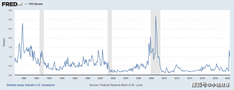衡量压力的一个常用指标是“泰德利差”(Ted spread),即三个月期美国银行间拆放款利率以及国库券利率之差。下图为过去几十年间“泰德利差”的具体走势。