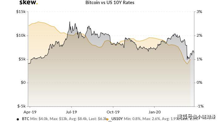 比特币与美国10年期债券的收益率之比。资料来源:Skew.com