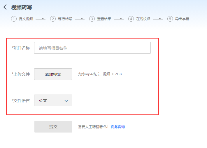 这时候我们按照要求填写项目的名称,将我们需要添加字幕的视频给上传上去,然后选择对应的文件语言即可提交,提交之后就等待平台的转换。