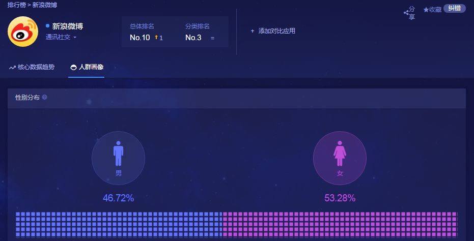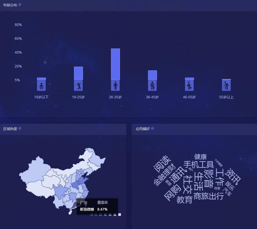 我们可以查询到微博用户的男女性别比、年龄分布情况、区域热度、以及应用偏好占比。