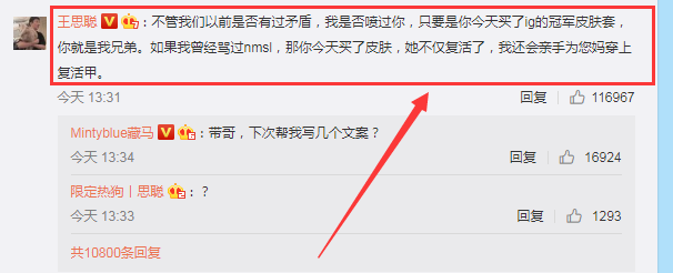 随后,王思聪还在这条微博下面留言,谁要是买了ig的冠军皮肤套,你就是我的兄弟,王思聪是谁啊,大名鼎鼎的富二代哦,谁要是买了就可以和他称兄道弟了。王思聪为了宣传产品,说的话也很接地气,也容易获得大众的亲近。