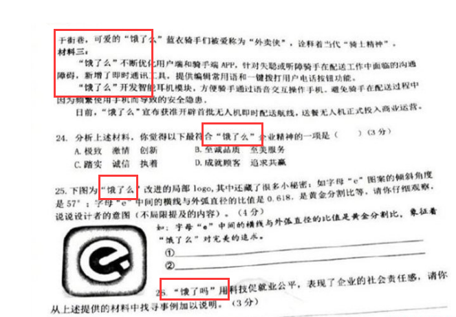 我们发现在试卷中不只一次出现饿了么这个字眼,还出现了大量饿了么试题,这是怎么回事呢?