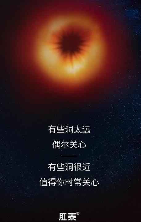 所以肛泰紧跟热点,管他什么版权不版权的,直接在微博上做起了借势营销,他们把黑洞的照片做了修改,酷似人体的某个器官,宣传语写的是“有些洞太远,偶尔关心——有些洞很近,值得你时常关心”。两相结合,着实令人浮想联翩。