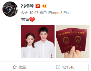 昨天早上10:07分,赵丽颖和冯绍峰同时在微博晒出结婚证和结婚照。宣布官宣的消息。