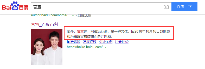 短短几个小时,官宣二字居然有了百度百科词条,还介绍了“官宣体”一词的来源,都跟这二人有关。