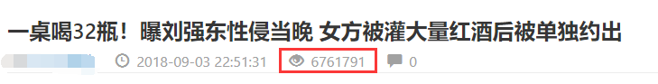 比如最近很火的刘强东事件,频繁上热搜,有人就写出了一篇标题为这样的文章:一桌喝32瓶!曝刘强东性侵当晚 女方被灌大量红酒后被单独约出,此标题一看娱乐八卦味超级沉重,符合大众胃口,文章内容只有短短一两百字,配上乐几张图片,短短几小时,阅读量高达670万。