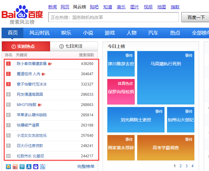 比如今天百度风云榜的热点事件有陈小春自爆遭家暴,《魔道祖师》遭粉丝人肉自杀,章子怡代替范冰冰。