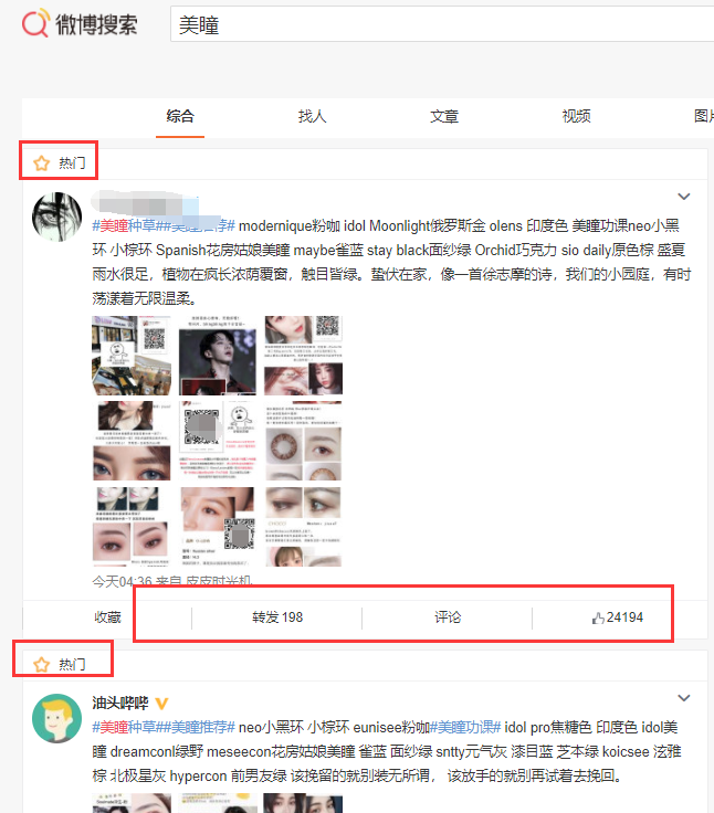 同时在这里有一个一直都有很多人在做的微博热门前三:意思就是通过一些技巧将你的微博做到热门前三的位置;比如我是做美瞳代理的,当用户在微博上面搜索关键词美瞳的时候。