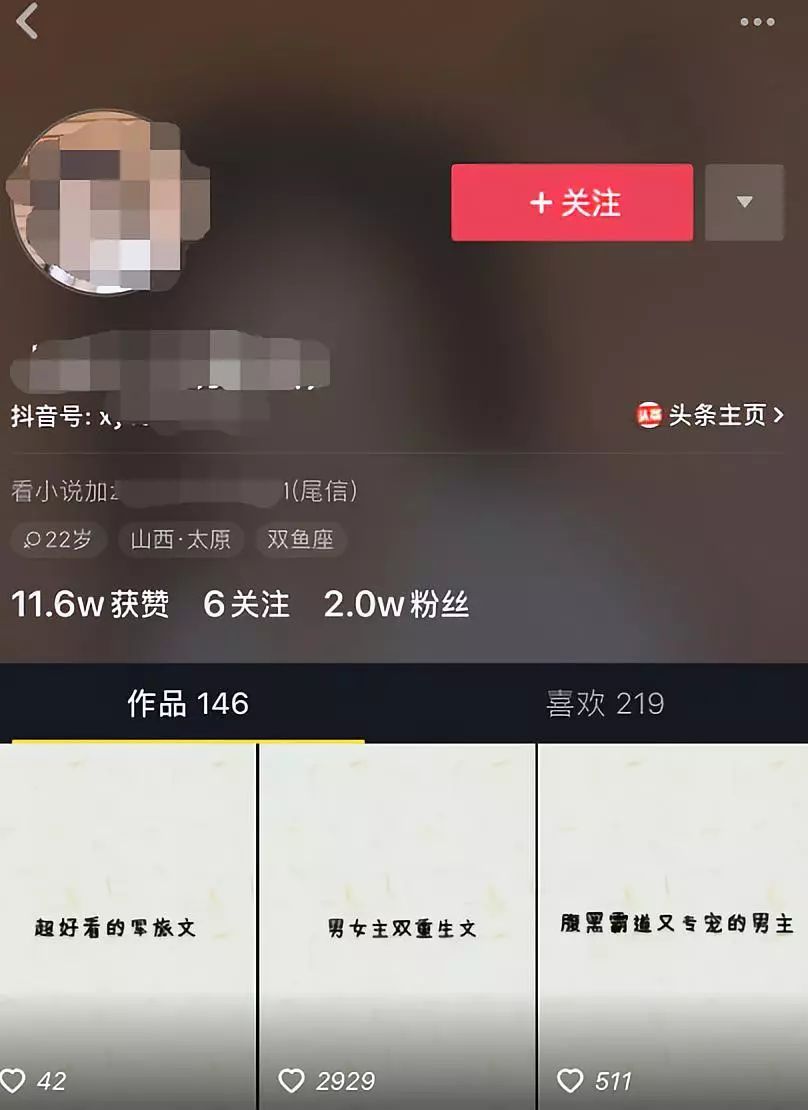 首先我们来看抖音上做小说项目的号,点进去来看看这些号的视频内容,可以看到里面的内容都是以小说的截图为主,这种方式直白、简单方便、还易上手。我们可以通过抖音主页面中以及视频最后一页中留下的联系方式,引导用户添加微信。